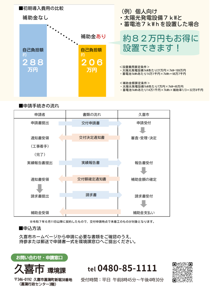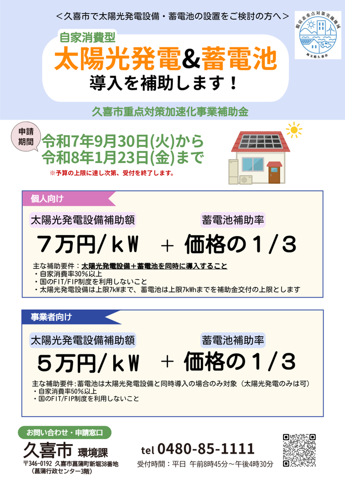 久喜市では、国の地域脱炭素移行・再エネ推進交付金(重点対策加速化事業)を活用し、自家消費型の太陽光発電設備・蓄電池を導入する市民、事業者に対し、補助を行います。